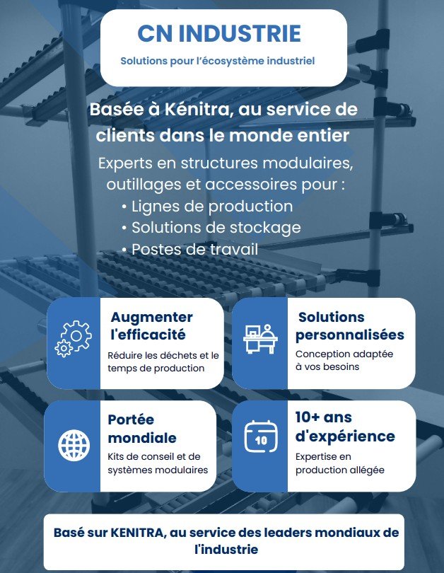 CN INDUSTRIE est un leader marocain des systèmes modulaires allégés. Nous concevons et produisons des solutions à base de tubes pour optimiser la productivité, réduire les déchets et rationaliser les flux de travail, avec un support technique complet, de la conception à l'installation. Améliorez l'efficacité grâce à des solutions de fabrication. Offrir des solutions éducatives avec des conseils techniques. Structures modulaires utilisées dans les racks de production et de stockage.